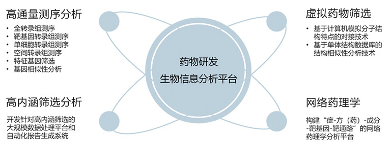 在新药研发过程中,针对如何找到药物作用靶点,建立了以阐明“症-方(药)-成分-靶基因-靶通路”为目标的虚拟药物筛选平台和网络药理学分析平台。包括基于计算机模拟分子结构特点的对接技术和基于中药成分结构数据库的结构相似性分析技术,以及涵盖了PPI蛋白互作关联、转录因子调控、靶基因预测等多方面的网络药理学分析平台。此外,整合包括全转录组、靶向转录组、单细胞转录组、空间转录组在内的不同转录组数据类型,搭建高通量转录组测序自动化分析平台。