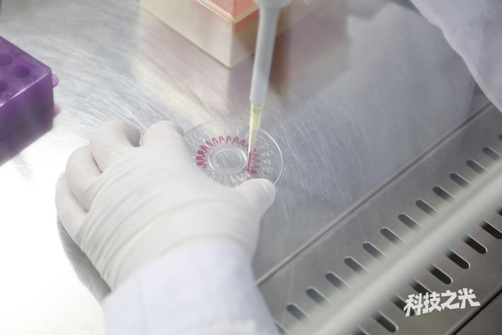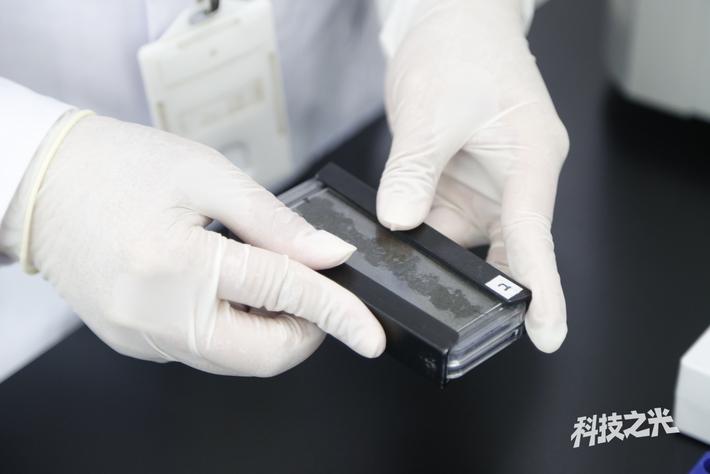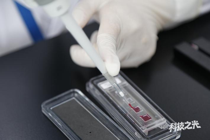 设计上经过不断优化的碟式芯片,仅用微量样本就可一次并行完成多个指标的检测,图为样本被注入到芯片中间部位的联通管道中。