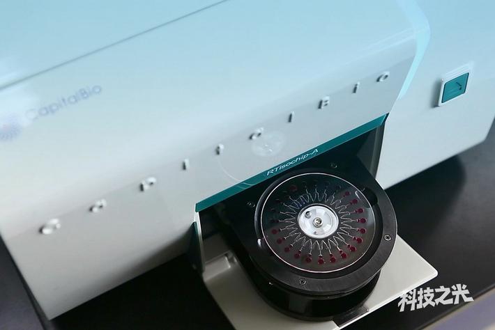 通过仪器30秒的高速旋转离心,芯片联通管道中的样本被快速“甩”入到周围24个圆形的反应池中。