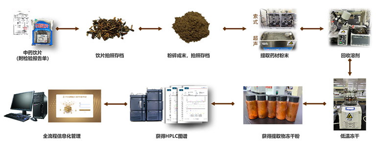 物质库平台承担研发用中药饮片的采购、粉碎、提取和储存,原料出入库管理,中药指纹图谱分析等工作。根据当前项目对中药研发的需求,建立了(1)基于2020版《中国药典》的616味中药提取物库;(2)包括藏药、维药、傣药在内的多个民族药提取物库。此外,平台利用HPLC技术构建中药指纹图谱,助力药材质量管理及成分检测。结合中药现代化、信息化管理需求,和大数据与人工智能研究院共同开发中药高通量筛选实验室信息管理系统,实现对药物采购、出入库、提取、储存、质控全流程的数字化可溯源管理。物质库平台极大地提高了中药研究的准确性和可重复性,为药理药效研究提供了全方位的支持。